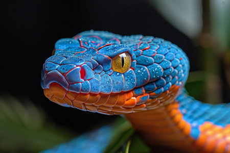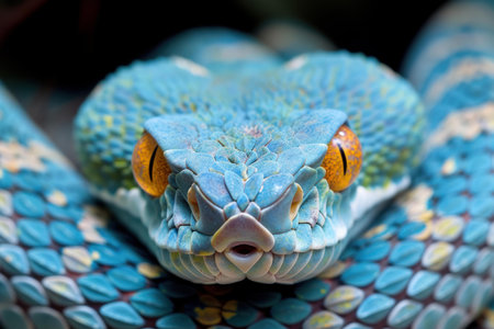 Close-up macro shot of a vivid blue viper with intense orange eyes and textured scales, showcasing the natural beauty and dangerous elegance of this venomous snake in its wild tropical habitat