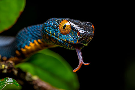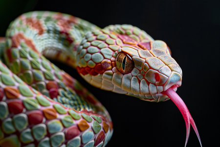 Green viper with tongue out, dark background, macro shot, intense and captivating