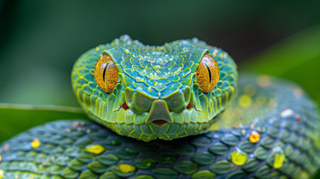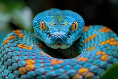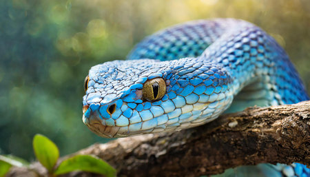 Mesmerizing close up photograph of a stunning blue viper snake coiled and poised amidst the lush verdant foliage of a tropical jungle or forest environment The reptile s vibrant scales