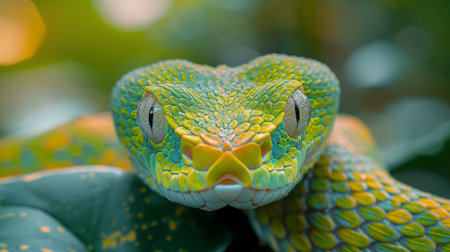 AI-generated image of a hyper-realistic green viper coiled tightly, its scales glistening with vivid emerald and teal tones accented by bright yellow speckles.