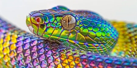 Close-up image of a vibrant, textured, and colorful exotic snake