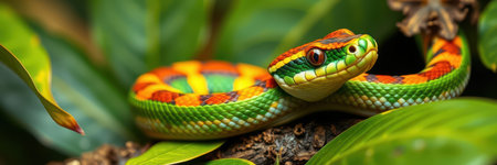 Colorful snake resting on green leaves in a vibrant tropical habitat with detailed patterns and bright colors