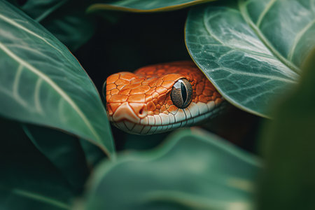 Close-up of orange and brown snake head in tropical foliage, symbolizing stealth, nature, and exotic wildlife photography.