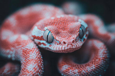 A close up of a colorful red and white snake with intricate patterns, showcasing its shimmering scales and distinct features on a dark background