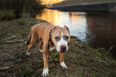 Portrait of an American Pit Bull Terrier in the autumn forest in the evening.