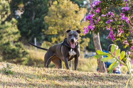 Pit bull dog playing in an open field at sunset. Pitbull blue nose in sunny day with green grass and beautiful view in the background. Selective focus.