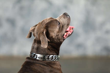 Picture of adorable American Staffordshire Terrier dog barking at the camera, sitting and wearing a leash at neck against gray studio background