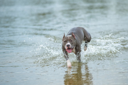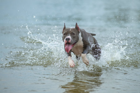 A beautiful purebred American Staffordshire Terrier plays in the water.