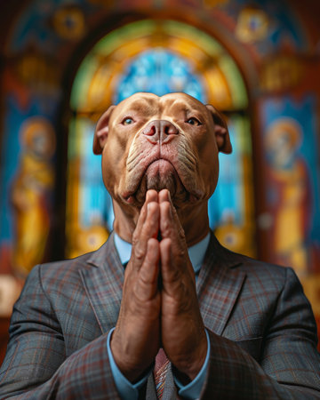 A Pitbull terrier wearing a formal suit and tie, looking serious and praying in front of a colorful stained glass window in a church. The image is humorous and unique, capturing a surreal moment.