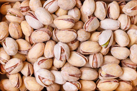 Macro image of salty pistachios in nut shell, pistachios top view in high resolution