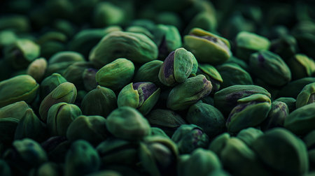 Pile of unshelled pistachios on dark surface illuminated by soft light