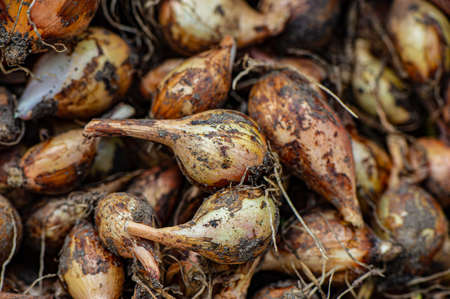 golden bulbs of harvested onions, close-up. Summer season. Web banner.