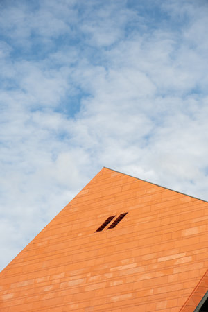 This structure features a slanted roof and expansive glass window emphasizing modern architecture. The clear sky provides a serene backdrop highlighting the buildings clean lines and style.