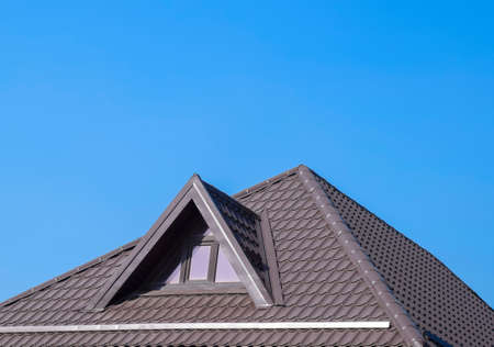 White artificial wooden gable roof with concrete brown roof tile of vintage house against blue sky background