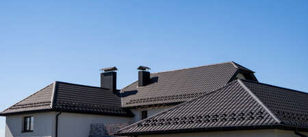 Brown corrugated metal profile roof installed on a modern house. The roof of corrugated sheet. Roofing of metal profile wavy shape. Modern roof made of metal. Metal roofing.