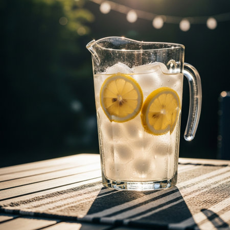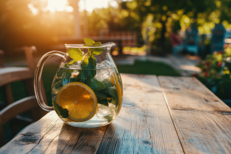 A beautiful glass pitcher filled with iced drinks, featuring vibrant slices of lemon and fresh mint leaves, basks in the warm sunlight of a lovely outdoor garden. The refreshing beverage glistens, inviting guests to enjoy its cooling qualities. Nearby, rustic wooden tables and comfortable seating create a welcoming atmosphere perfect for an afternoon gathering. The tranquil setting encourages relaxation and enjoyment among friends or family amidst natures beauty.
