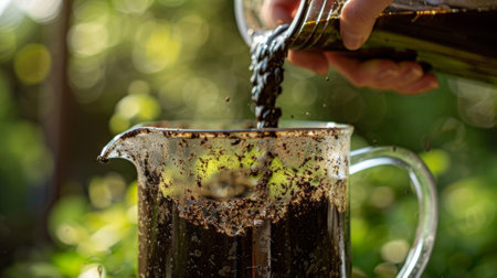 A hand stirring a pitcher of fresh compost tea giving a rich aroma of earth and organic matter