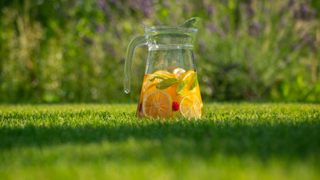 Pitcher of citrus lemonade on the green grass in a garden with flowers in the background