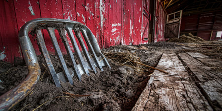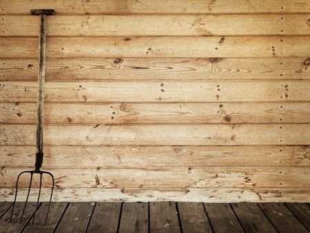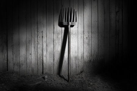 A rustic pitchfork stands against a weathered wooden wall, casting shadows on the ground, creating a nostalgic atmosphere with agricultural elements and textures