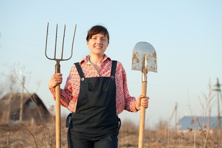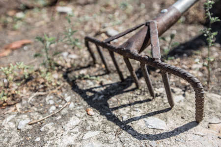 Closeup of hoe and field in spring. The concept of the garden, the beginning of the season, summer cottage.