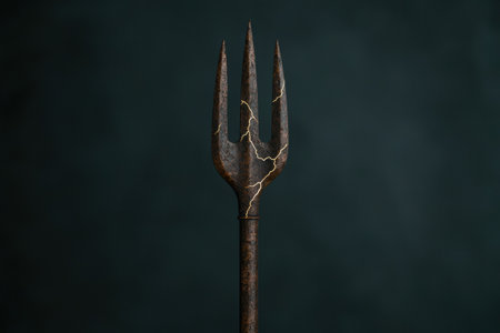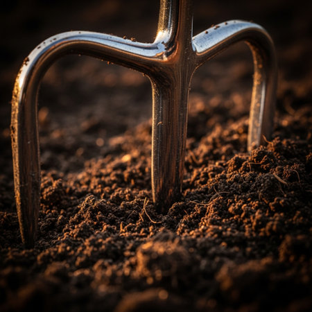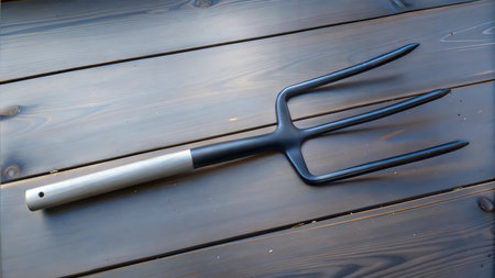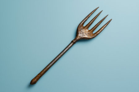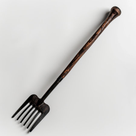 A detailed close-up of a vintage gardening fork, featuring long prongs and a rustic design. The image captures the essence of agricultural tools with character.