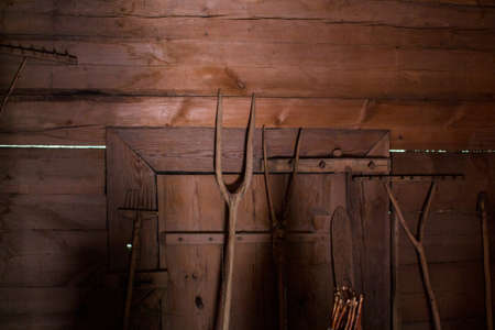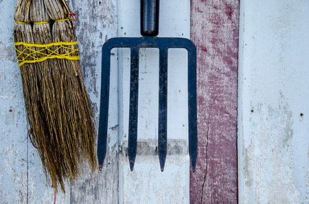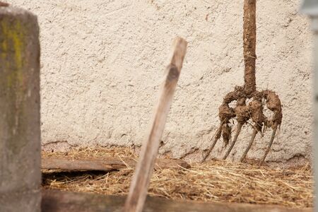 Wooden handle of a tool on a farm against a metal gate in a hay barn in the Netherlands