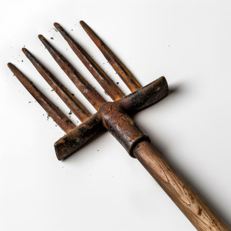 Close-up view of a vintage rusty garden fork set against a white background, highlighting its weathered texture and soil particles, perfect for agricultural themes.