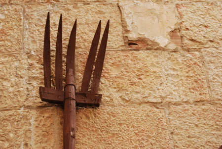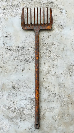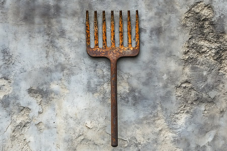 Image shows rusted, vintage garden fork with handle on a textured gray wall background. The tool is isolated with signs of age and wear.