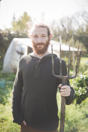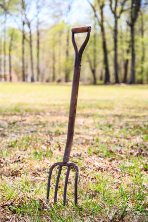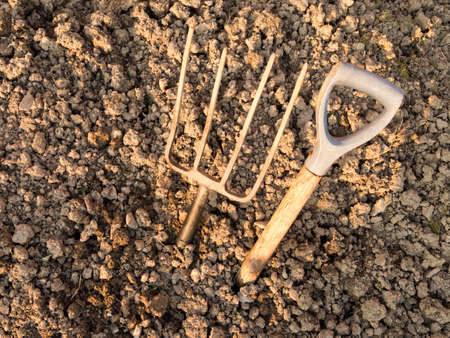 Digging fork in the garden, gardening tool for a gardener, copyspace
