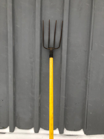 a gardening fork, sticking in the ground, concept digging and hobby gardening or agriculture