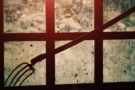 Old pitchfork leaning against red brick wall, old and weathered on a farm, indoor light coming from outside