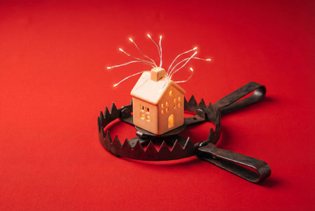 Miniature pale orange house model with glowing white lines from roof balanced on metal bear trap symbolizing real estate vulnerability in financial concept illustration