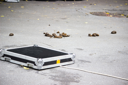 a metal suitcase lies in the middle of the road