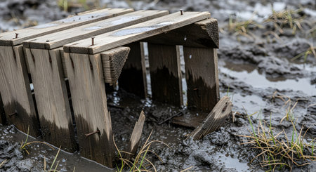 A broken, overturned wooden crate sits abandoned in a wet, muddy field. The wood is weathered and dark from the water, and rusty nails are visible. The image evokes a sense of desolation, neglect, or the aftermath of a storm or flood.