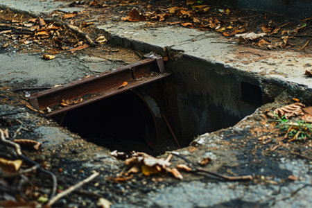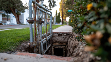 A neglected underground access point with a rusted frame, hinting at hidden depths and potential hazards
