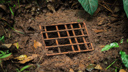This image showcases a round drain cover embedded in dark, muddy soil, highlighting the intricate texture and environment around it.