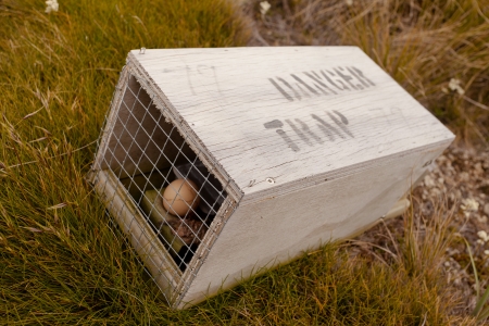 Baited small animal trap used for rat and stoat control with written warning for humans
