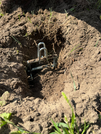 Gardener sets up mole trap in runway using metal hooks. Placing trapping in holes under soil. Catching pest in tunnel