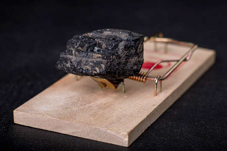 A black lump of brown coal placed in a mousetrap. A trap in the form of coal used to obtain energy. Dark background.