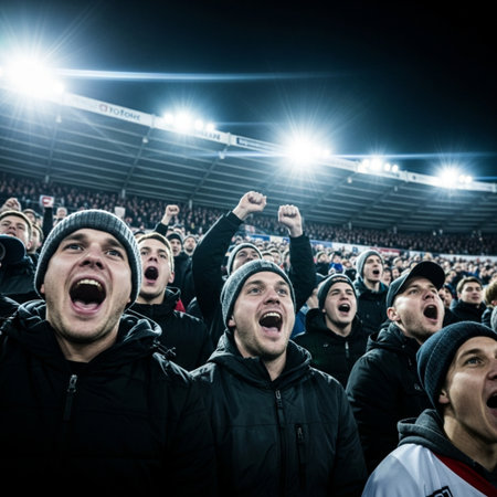 A diverse group of individuals standing together, raising their hands in a show of support and unity, A group of fans cheering and chanting in support of their team