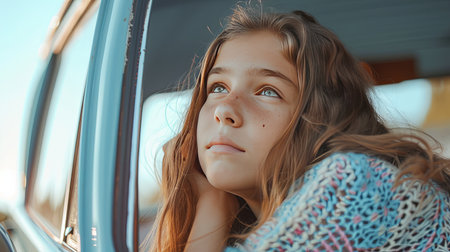 A family enjoying a road trip, captured from the backseat with kids looking out the window at passing landscapes.
