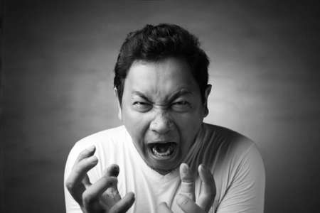 Young Asian man wearing white shirt shouting because of anger. Close up head and shoulders, monochrome black white image