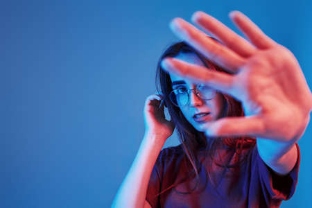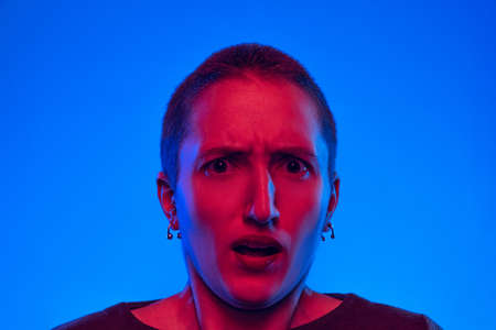 Close-up young scared woman, student with short hair looking at camera isolated on dark blue background in neon light. Concept of emotions, gender x