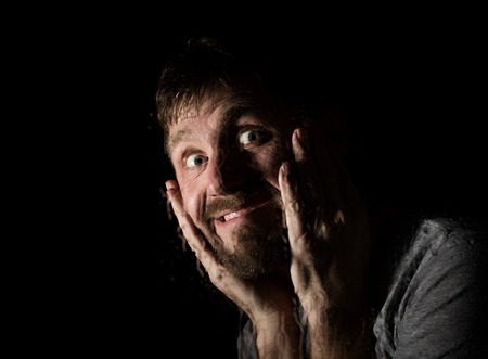 Dark portrait of scary bearded man with smirk, expresses different emotions. Drops of water on a glass, hand and male face.
