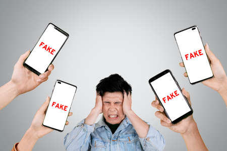 Picture of young man looks stressful while getting fake news on the cellphone in the studio