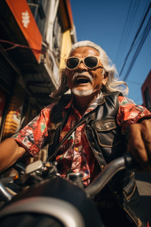 Elderly Chinese man looks youthful in studio portrait, wearing trendy clothing and accessorized with sunglasses and a cap.