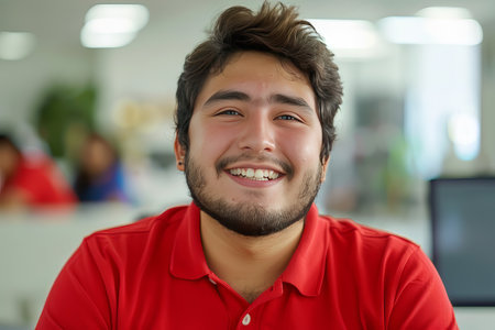 A young Mexican community manager wearing a red polo shirt in a well illuminated white office, laugh. High quality photo