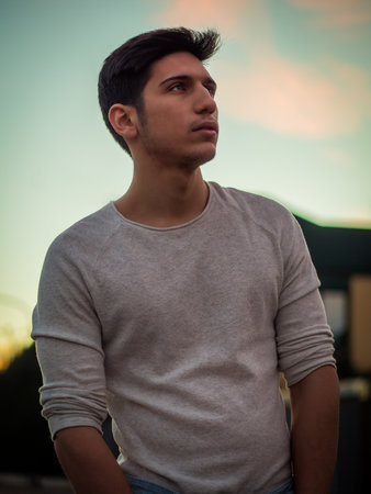 a handsome young man looking away from camera in winter evening. his face is lit with evening light. some bushes and a clear blue sky in the background. he is wearing a sports jacket