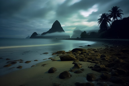 Awe-inspiring view of misty mountains amidst a serene ocean in a tropical landscape.