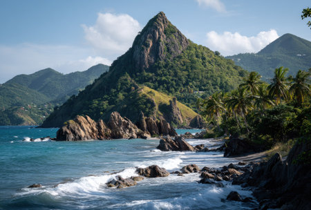 Coastal view featuring a dramatic mountain peak rising from rocky shoreline. Turquoise water and palm trees